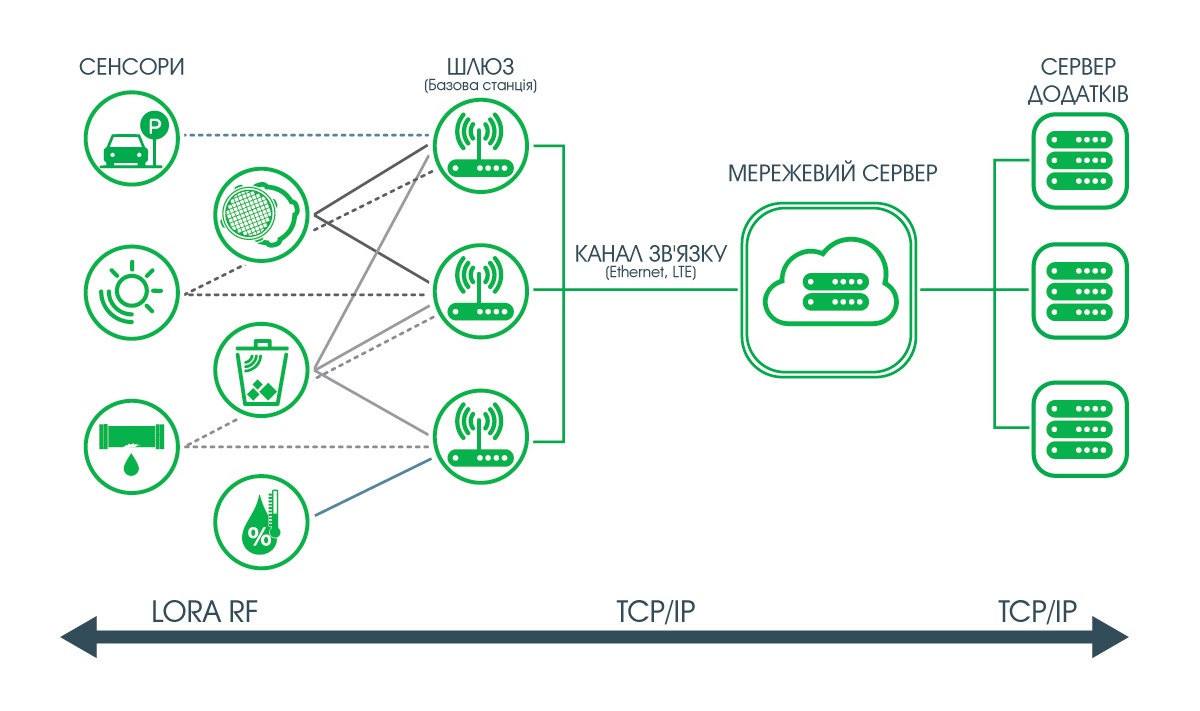 У мережі LoRaWAN кінцеві пристрої (радіомодулі) направляють дані на концентратор (шлюз, базова станція). Від базової станції по швидкісному каналу пакети даних передаються на сервер, який, в свою чергу, віддає конкретний тип даних відповідному серверу додатків.